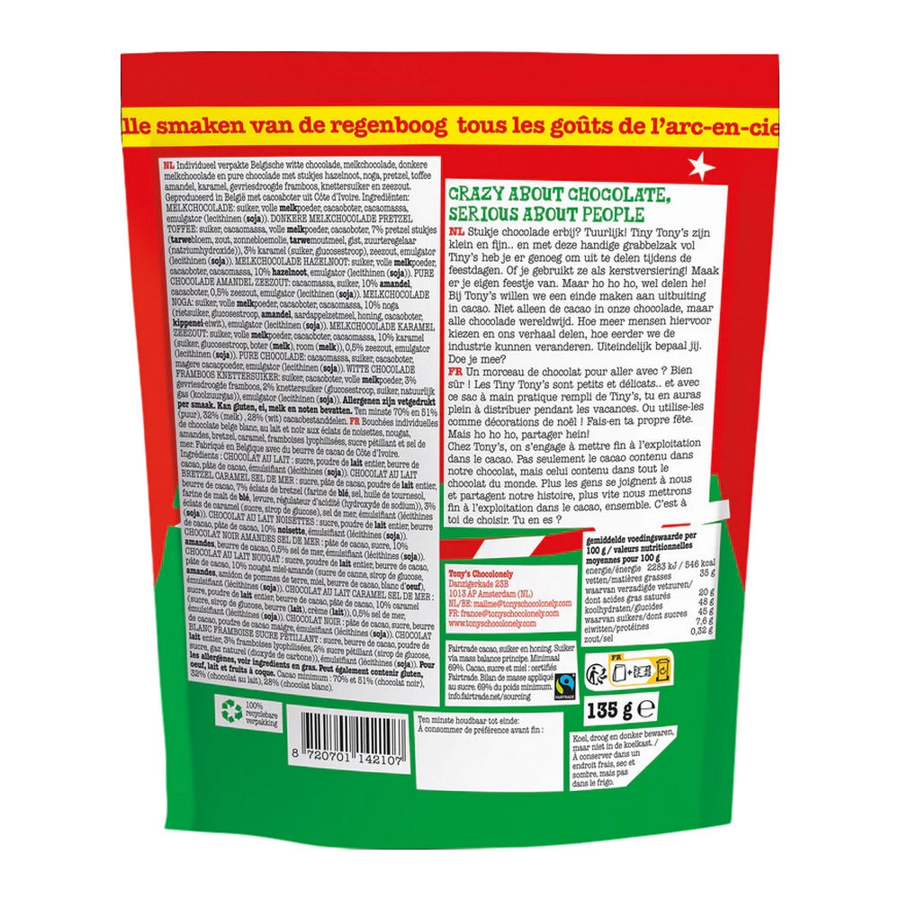 De Tiny Tony's Kerstmix brengt de feestelijke sfeer naar elke gelegenheid. Het doet dit met een speciale selectie van kleine chocolaatjes in verschillende smaken. Deze vrolijke mix is perfect als cadeautje of om uit te delen tijdens kerstvieringen. De kleurrijke chocolaatjes zorgen voor een ware smaaksensatie en maken van elk moment een feest. Het is gemaakt van slaafvrije chocolade. Hierdoor biedt deze kerstmix niet alleen een heerlijke traktatie, maar ook een bewuste keuze voor een betere wereld. Geniet van de diversiteit aan smaken en vier de feestdagen met liefde en chocolade.